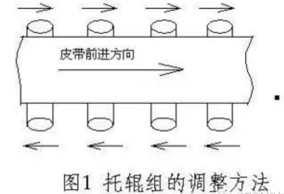 1 .調(diào)整承載托輥組 皮帶機的皮帶在整個皮帶輸送機的中部跑偏時可調(diào)整托輥組的位置來調(diào)整跑偏;在制造時托輥組的兩側(cè)安裝孔都加工成長孔,以便進行調(diào)整。具體調(diào)整方法(見圖1),具體方法是皮帶偏向哪一側(cè),托輥組的哪一側(cè)朝皮帶前進方向前移,或另外一側(cè)后移。如圖1所示皮帶向上方向跑偏則托輥組的下位處應當向左移動,托輥組的上位處向右移動。