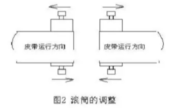 3. 調(diào)整驅(qū)動滾筒與改向滾筒位置 驅(qū)動滾筒與改向滾筒的調(diào)整是皮帶跑偏調(diào)整的重要環(huán)節(jié)。因為一條皮帶輸送機至少有2到5個滾筒,所有滾筒的安裝位置必須垂直于皮帶輸送機長度方向的中心線,若偏斜過大必然發(fā)生跑偏。其調(diào)整方法與調(diào)整托輥組類似。對于頭部滾筒如皮帶向滾筒的右側(cè)跑偏,則右側(cè)的軸承座應當向前移動,皮帶向滾筒的左側(cè)跑偏,則左側(cè)的軸承座應當向前移動,相對應的也可將左側(cè)軸承座后移或右側(cè)軸承座后移。尾部滾筒的調(diào)整方法與頭部滾筒剛好相反。調(diào)整方法(見圖2)。經(jīng)過反復調(diào)整直到皮帶調(diào)到較理想的位置。在調(diào)整驅(qū)動或改向滾筒前最好準確安裝其位置.